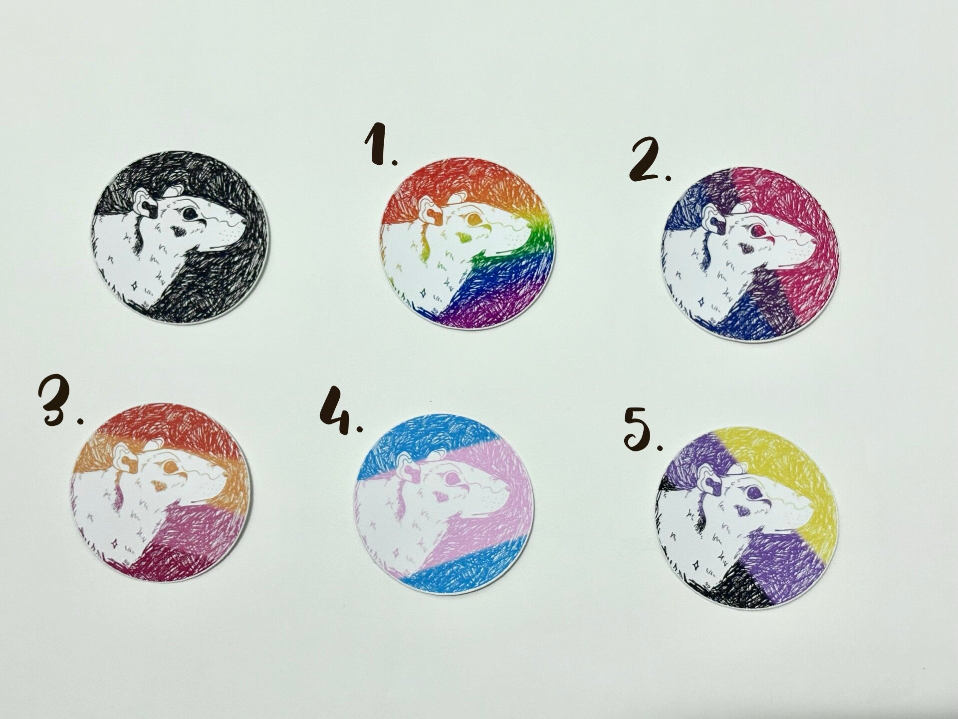 Unieke zelf ontworpen stickers met charmante ratten in verschillende thema’s: verkleed als grappige clowntjes, betoverende feeën en kleurrijke ratten in pride-stijl. Afmeting: 8 cm.